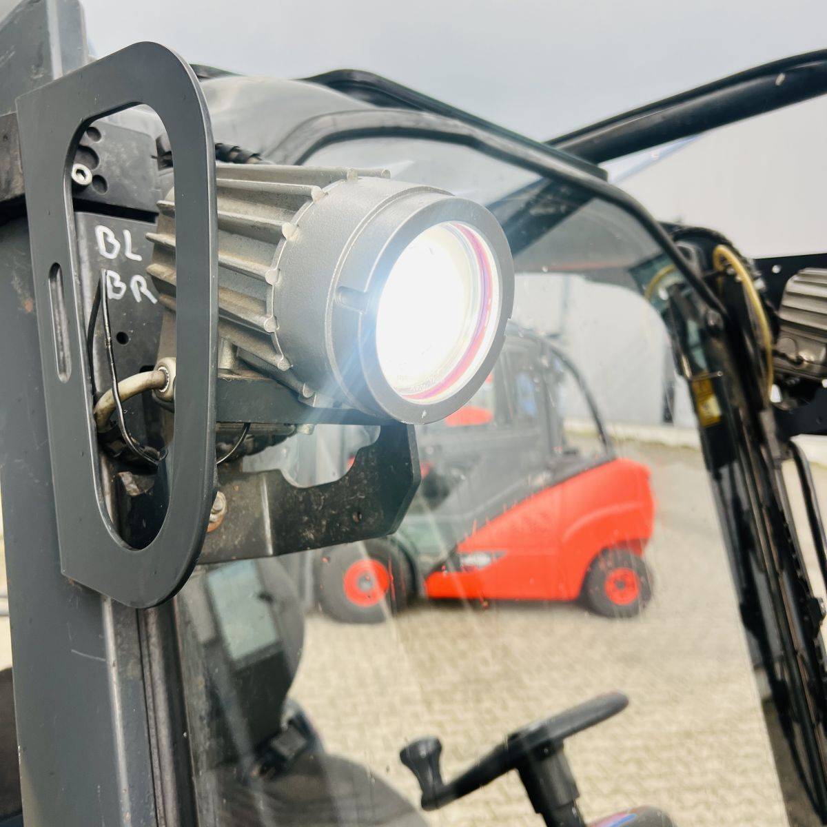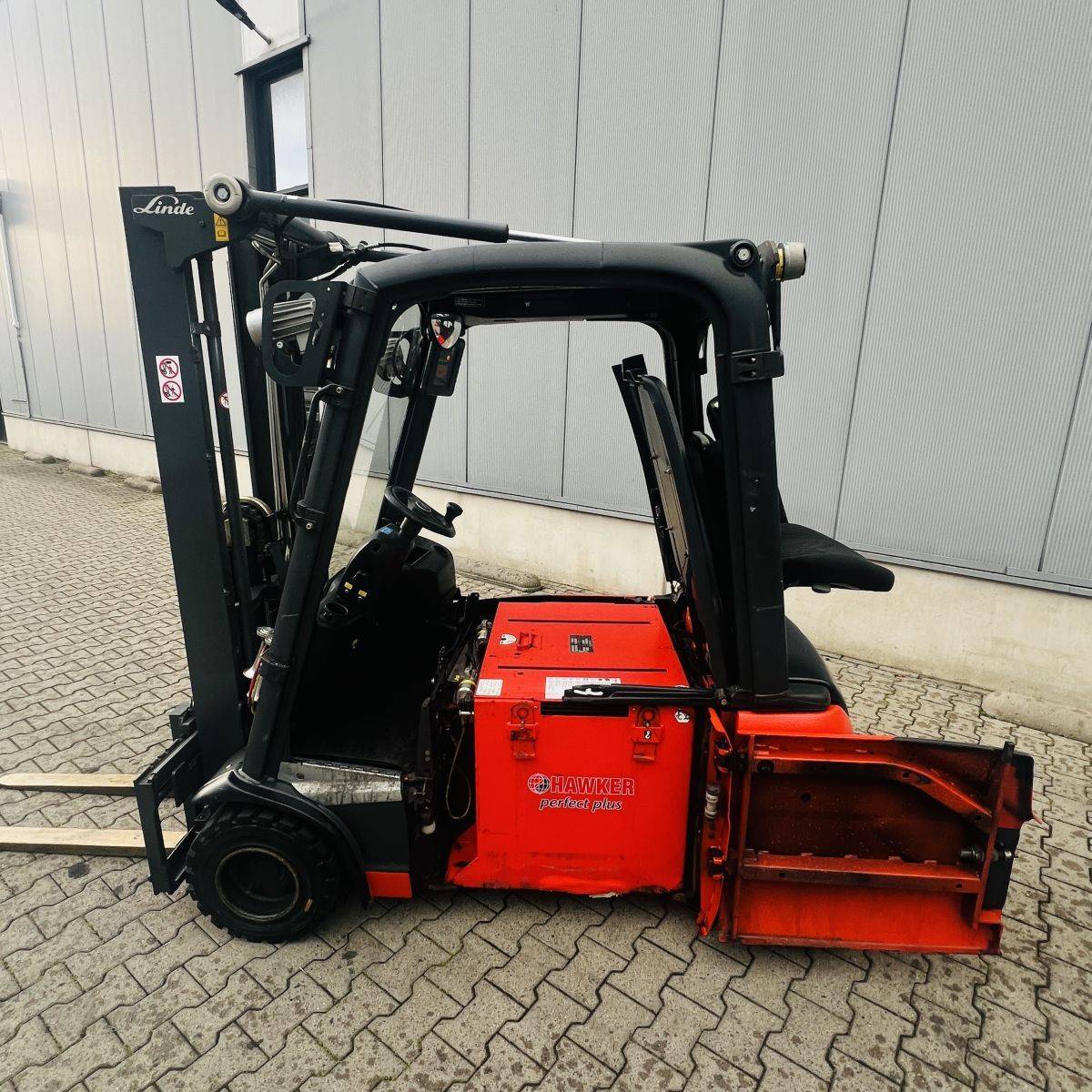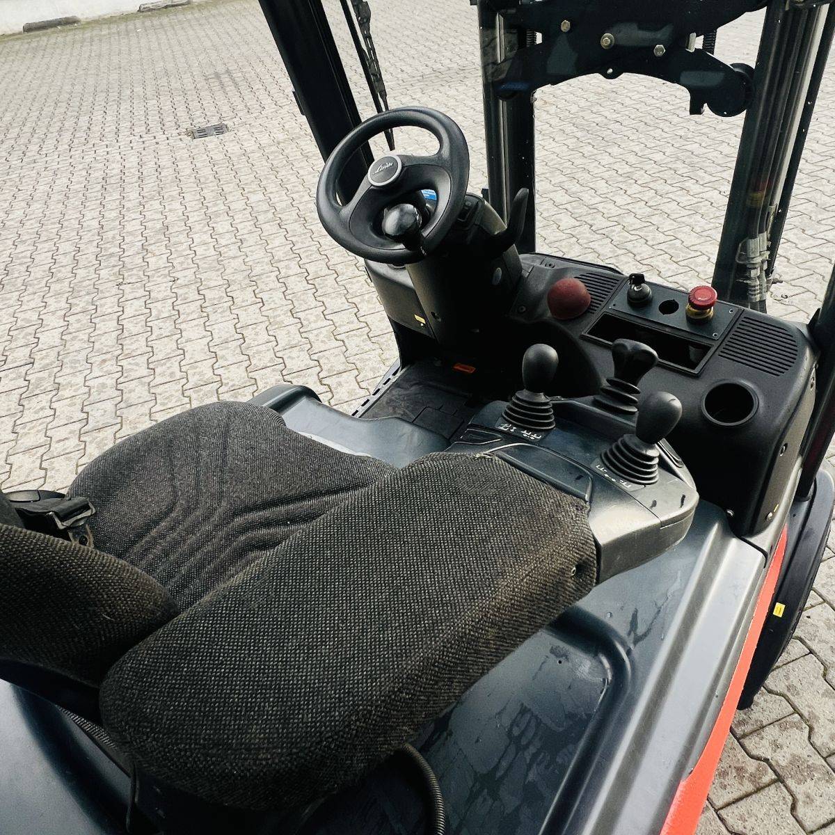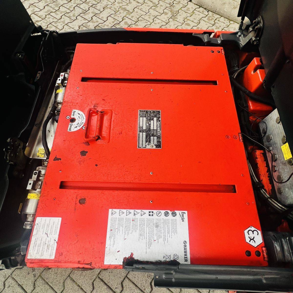 Zone 1 (2G) ATEX-Explosionsgeschützt. PROPLAN (offiziell Linde). Duplex-Voll-Freihub Mast, 3. Ventil, integrierter Seitenschieber, bronzebeschichtete Gabeln 1.000 mm. Fahrerkabine: Einpedal-anordnung, Frontscheibe mit manuellem Scheibenwischer, Dachscheibe, Arbeitsscheinwerfer, Blitzlicht, akustisches Signal, Komfortsitz mit neuen antistatischem Kissen. Batterie: Hawker Ex 5PzS 625 Ah (2016), ohne Ladegerät. Spezielle antistatische Continental-Reifen vorne und hinten, neue antistatische Heckabdeckung. Optional: Lieferung mit einem Triplex-/3-stufigem Mast möglich: 3.000 € Aufpreis.